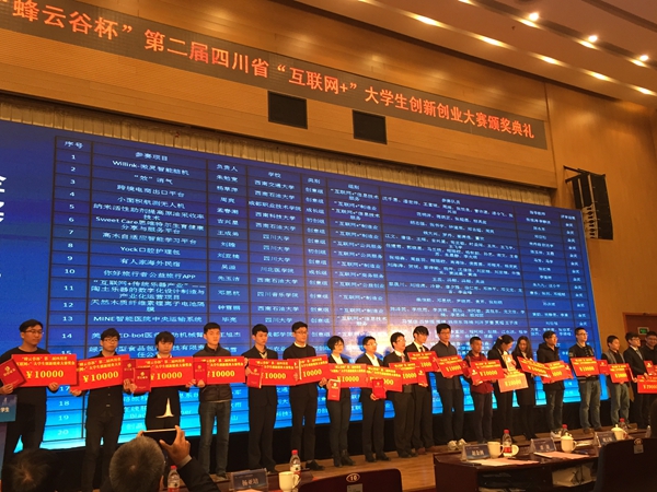 11月25日,四川省第二届“互联网+”大学生创新创业大赛颁奖典礼在西南石油大学举行,四川省教育厅、网信办、发改委、经信委、人社厅、知识产权局、社科院、团省委等部门负责人出席典礼并颁奖。学校副校长张强,学生处副处长、校团委副书记冷军及金奖团队学生代表参加了颁奖典礼。我校学生作品获得全国比赛铜奖1项、四川省金奖1项、银奖3项、铜奖7项,学校因出色的比赛成绩和组织工作获得“优秀组织奖”。