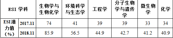 生物学与生物化学,环境科学与生态学两个ESI潜力学科学术提升显著,距ESI全球前1%的达成度有较大进展,较去年同期提升了11.9%和15.5%。另外,工程学、分子生物学与遗传学、微生物学和化学4个ESI学科的潜力值也稳步提升。