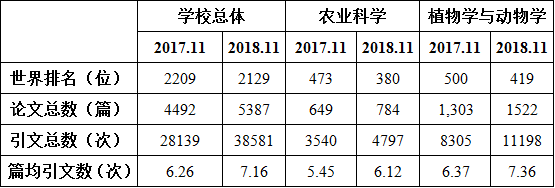 根据美国ESI(Essential Science Indicators,基本科学指标数据库)2018年11月发布的最新数据(2008.1.1-2018.8.31)显示,我校ESI学科建设水平取得较大进步。与去年同期数据比较,学校整体全球排名提升80名;农业科学排名提升93名;植物学与动物学排名提升81名。
