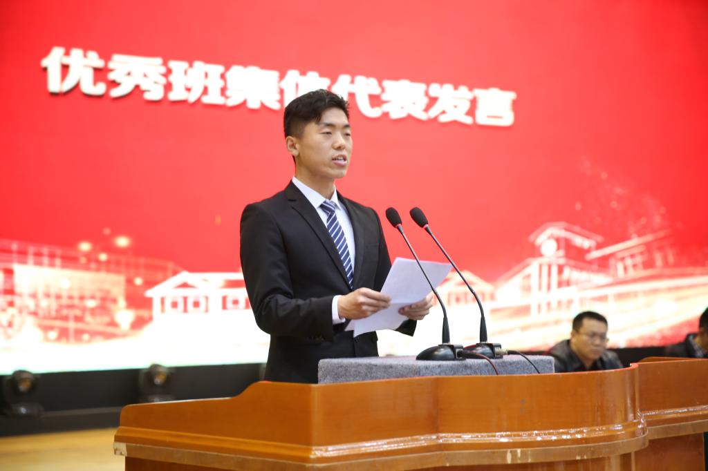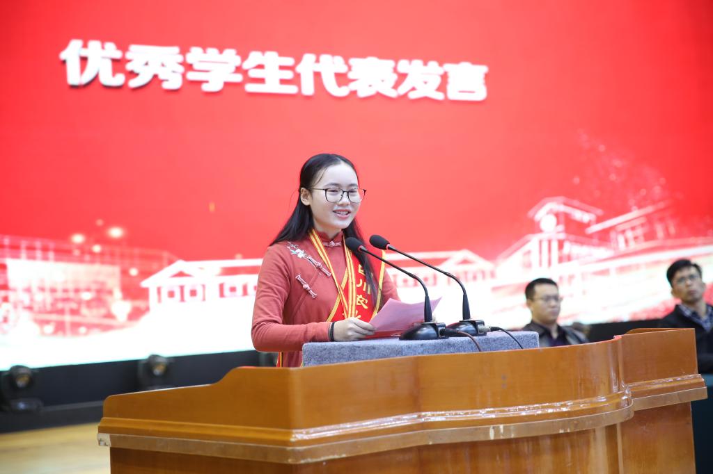 优秀学生代表,优秀学生标兵、国家奖学金获得者,人文学院汉语言文学专业2017级2班杨林舒同学,优秀学生标兵、国家奖学金获得者,资源学院地理信息科学专业2016级1班尹晓菡同学,优秀学生标兵、国家奖学金获得者,商学院市场营销专业2016级1班刘玉明同学分别发言,回顾了个人奋斗的励志故事,勉励大家要有善于时间管理的“巧劲”,敢为善成的“钻劲”,越挫越勇的“韧劲”。