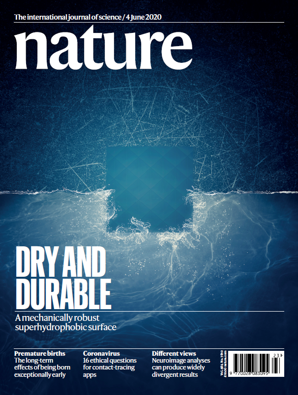 6月3日,国际权威学术期刊Nature正式刊发了我校校友、电子科技大学2016级博士研究生王德辉为第一作者的研究论文,题为《设计坚固的超疏水表面(“Design of robust superhydrophobic surfaces”)》(DOI:10.1038/s41586-020-2331-8),并被选为当期封面。该研究提出去耦合机制将表面浸润性和机械稳定性拆分至两种不同的结构尺度,通过在两个结构尺度上分别进行最优设计,为超疏水表面创造出具有优良机械稳定性的微结构铠甲,解决了超疏水表面机械稳定性不足的关键问题,该技术有望实现商业应用。该论文发表引起广泛关注,被phys.org、C&EN、新华网等国内外知名媒体转载报道。