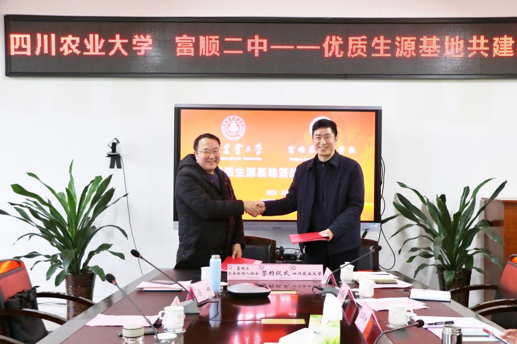 12月9日,学校与富顺二中优质生源基地签约授牌仪式暨人才培养合作洽谈在富顺县教体局举行。县人民政府副县长龚弟霞、历娜,县委组织部、县委编办、县教体局、县人社局、县教育考试中心、富顺二中、县农业经理人协会等部门(单位)领导参加了签约仪式及座谈会。