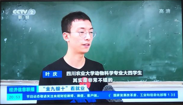 9月23日晚,中央电视台二台财经频道《经济信息联播》栏目对我校秋季校园招聘工作进行了报道,招生就业处处长杜彬和动物科技学院学生叶庆接受了采访。