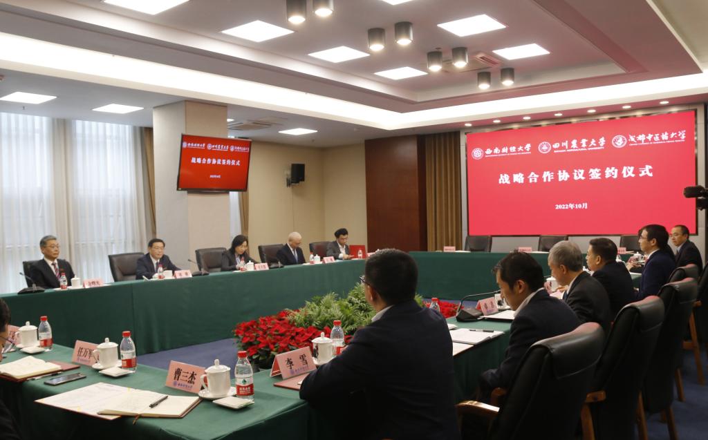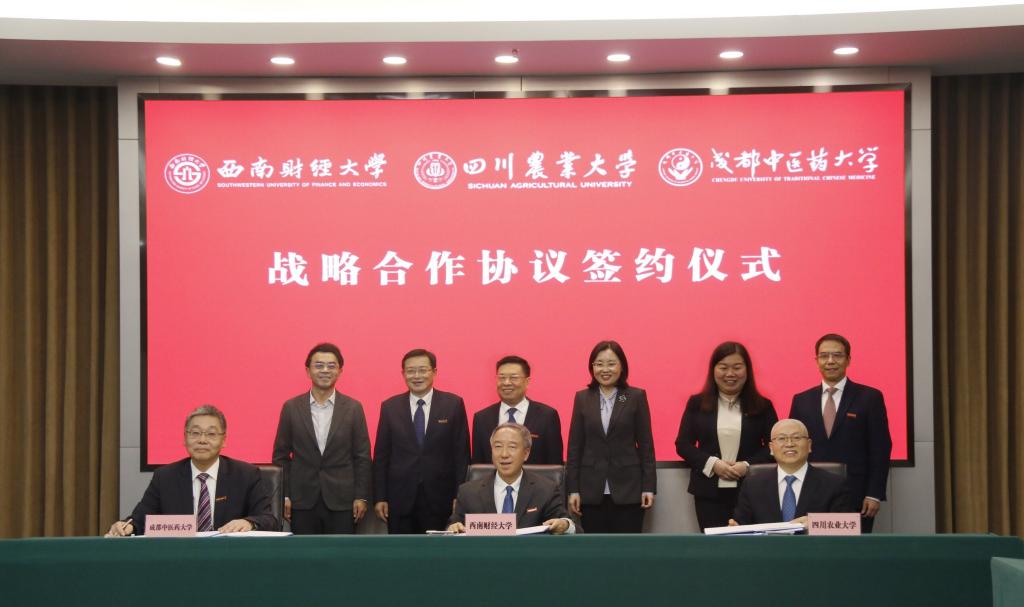 10月14日下午,我校与西南财经大学、成都中医药大学战略合作签约仪式在西南财经大学举行。校党委书记庄天慧、校长吴德、副校长李明洲,西南财经大学党委书记赵德武、校长卓志、副校长李志生,成都中医药大学党委书记刘毅、校长余曙光、副校长曾芳,以及三校相关职能部门负责人参加签约仪式。