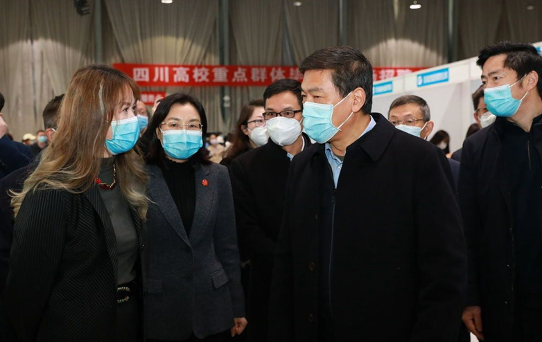 四川省副省长罗强等领导亲临专场招聘会现场,慰问用人单位和毕业生,详细了解参会的企业数量、涉及行业和地域、提供岗位质量和数量等情况,并与我校2023届林学专业残疾研究生毕业生小彤(化名)等重点群体毕业生亲切交谈。罗强细致地了解小彤的就业现状,询问是否想留在成都就业、今天应聘情况,并预祝小彤和广大毕业生们早日找到满意的工作。