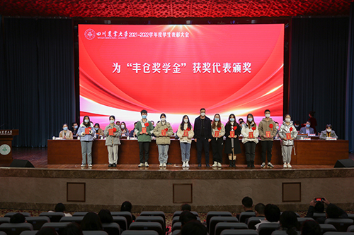 四川省丰仓农业科技有限公司总经理曹见波先生为“丰仓奖学金”获奖代表颁奖