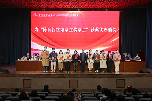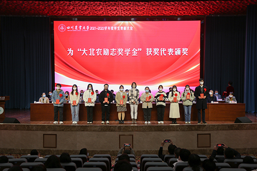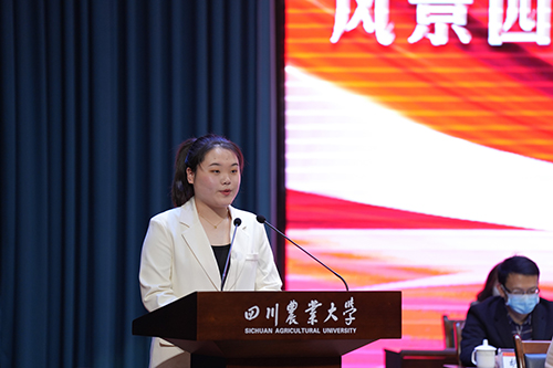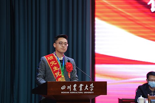 庄天慧为优秀学生标兵颁奖,吴德为研究生优秀标兵颁奖,鼓励他们再接再厉,在新的征程上继续弘扬“川农大精神”,取得更加优异的成绩。
