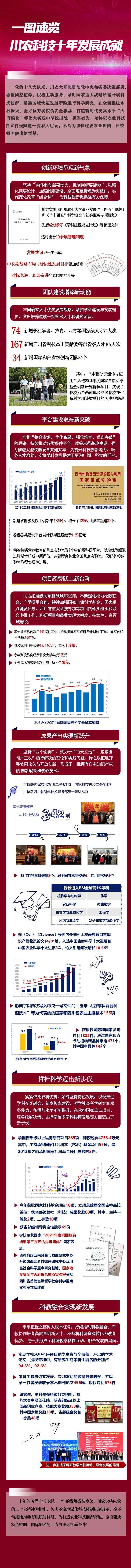10年来,川农大坚决贯彻党中央和省委决策部署,紧盯国家重大战略所需开展科技创新,瞄准区域快速发展所盼进行科学研究,在全面推进乡村振兴、全方位夯实粮食安全根基、打造新时代更高水平“天府粮仓”等伟大实践中尽锐出战、担当有为,用加快建设特色鲜明、国际知名的一流农业大学的新成就,为我国实现农业科技高水平的自立自强,高质量建设农业强国、科技强国、教育强国作出新贡献。