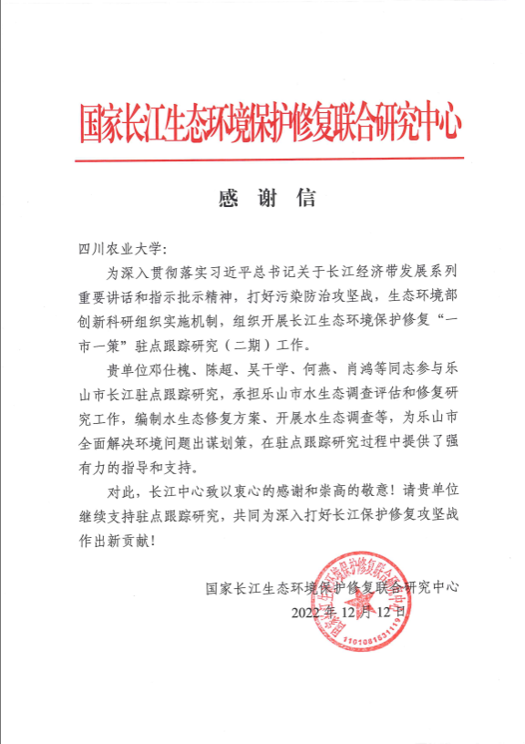 近日,国家长江生态环境保护修复联合研究中心发来感谢信,致谢我校环境学院邓仕槐、陈超、吴干学、何燕、肖鸿等同志所参与的长江生态环境保护修复驻点跟踪研究工作。