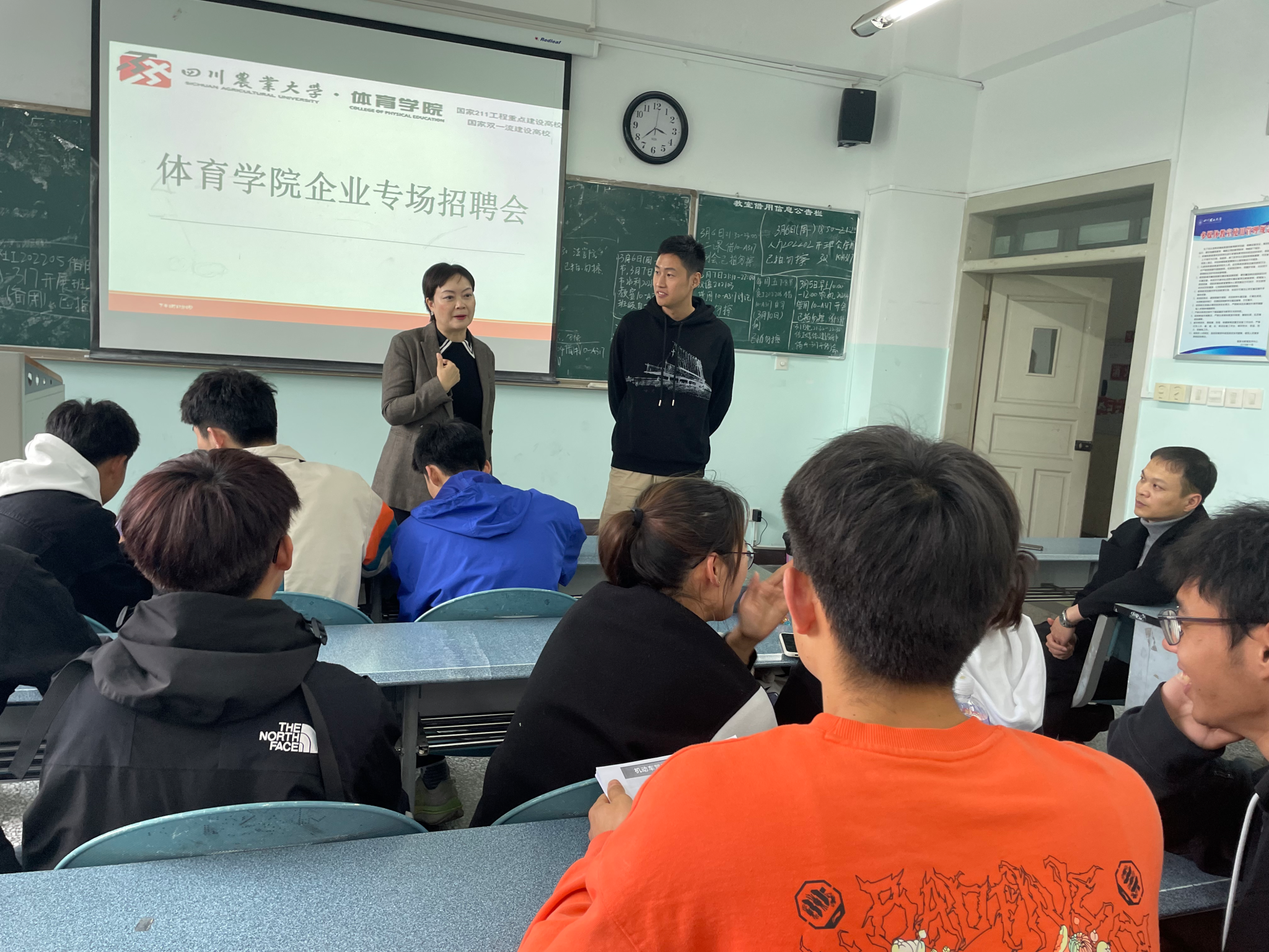 招聘会宣讲会现场,招聘专员们通过播放视频和现场讲解和答疑的方式详细地介绍企业的业务范畴、岗位职责、薪资福利、晋升空间、行业内的最新动态和未来发展趋势等,本次招聘会提供了运动中心员工、游泳救生员、健身房运营专员等6个岗位共计招聘10余人,在自由交流环节求职毕业生们围绕在各位招生专员身旁,等待着答疑解惑,求职场面热闹非凡,领导和辅导员现场“坐诊”,为前来参加应聘的毕业生加油鼓劲。不少低年级同学也来咨询寒暑假集中前往实习的具体问题,如往返路费、工作时间、工作内容、衣食住行,大家兴趣浓厚。