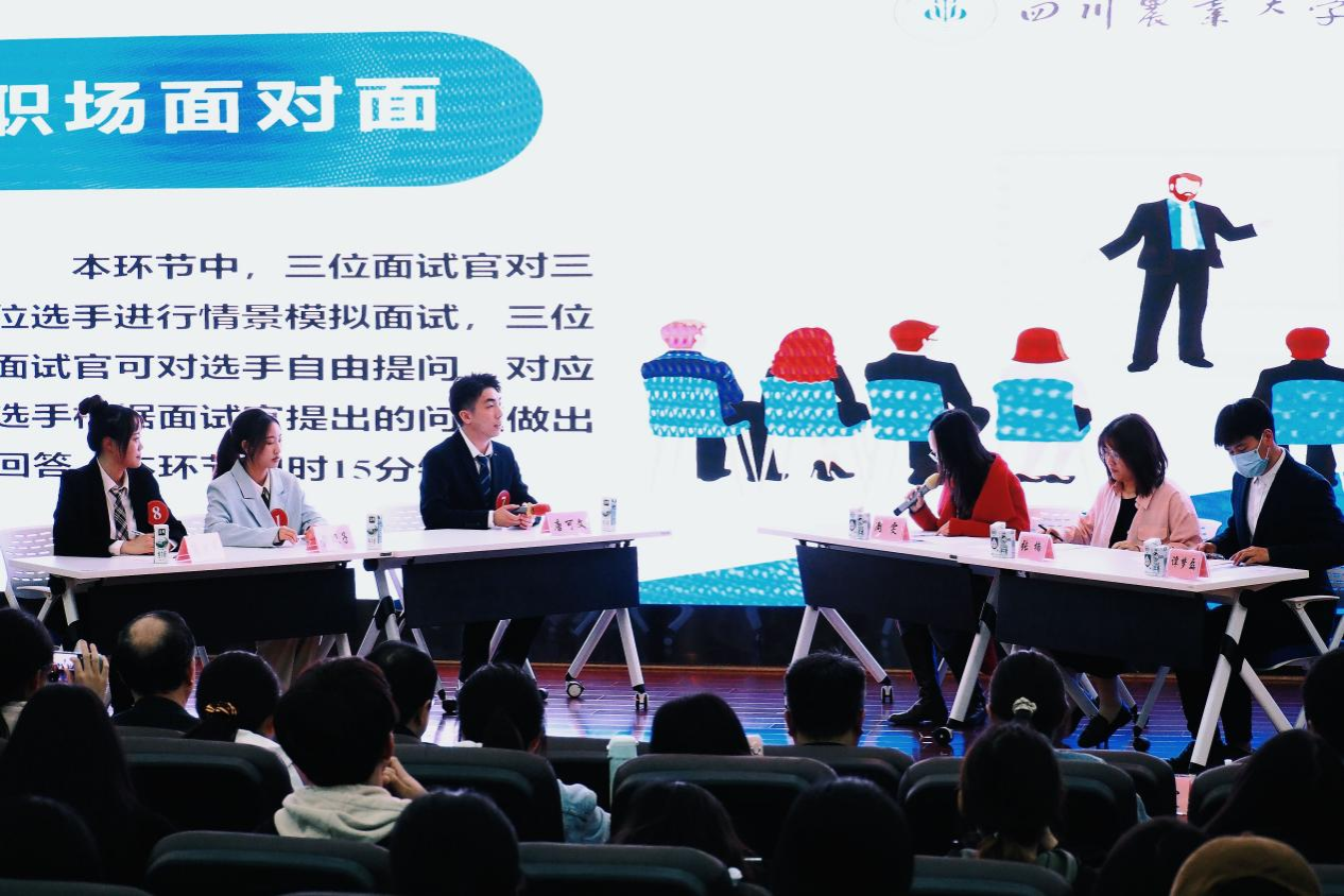 学校学生工作部部长、学生处处长李静波,招生就业处处长廖鹏,学校职业生涯规划与就业指导课程教研室主任、农学院党委书记黎明艳,校团委副书记赵野逸,招生就业处副处长王文龙,北京网聘信息技术有限公司-智联招聘智联校园市场负责人张楠,中电通商数字技术(上海)有限公司人力资源经理周雯,内蒙古伊利实业集团股份有限公司成都地区招聘主管谭梦磊共同担任评委,来自三校区的300余名学生到场观摩比赛。比赛现场通过微观川农直播号同步直播。