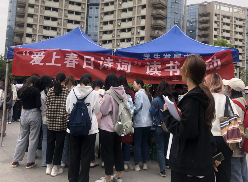 4月7日,读书月活动之“爱上春日诗词” 线下诗词接龙在三校区火热启动,吸引了600余名同学共赴一场绽放浓浓诗情画意的春日之约。同日,图书馆以“校园无处不书香阅读悦享向未来”为主题,推出了“第十二届读书节系列活动清单”。“书香校园”四月读书月活动由学生工作部、图书馆、校团委、研究生工作部联合举办。活动将分四类举行,一是开展读书调研活动,面向全校学生开展对读书的认识、读书目的、读书量、读书时长等方面的调研和采访,推出“我来荐书”书单。二是开展“我的读书清单”人物访谈活动,邀请同学们喜爱的老师、优秀校友面对面交流读书经验和感悟、进行书目推荐和介绍,实现教师与学生同书共读、同学共进,营造师生共读良好氛围。三是开展“我爱读书”主题班团活动,各团支部(小班)在4月份开展“我爱读书”主题班会或团日活动,深入学习习近平总书记的读书故事、关于读书的重要论述。四是开展各类读书主题活动,举办学校第十二届读书节、“朗读者”系列活动,通过开展读书心得分享、征文、演讲、手抄报、展览展示、阅读打卡等形式多样的活动。