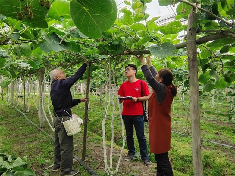 tyc41183太阳成集团研究生、都江堰猕猴桃科技小院院长钟森走访农户,调研生产问题。