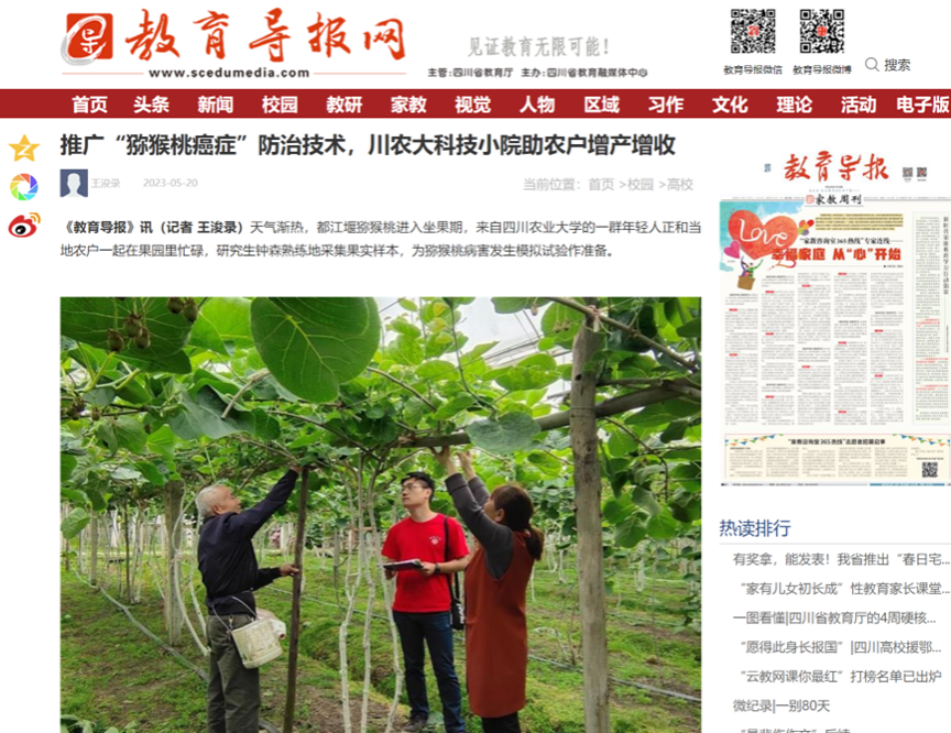 《教育导报》讯(记者 王浚录)天气渐热,都江堰猕猴桃进入坐果期,来自tyc41183太阳成集团的一群年轻人正和当地农户一起在果园里忙碌,研究生钟森熟练地采集果实样本,为猕猴桃病害发生模拟试验作准备。