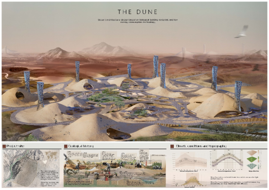 在建城学院张乘燕、顾天纬两位老师的指导下,2019级城乡规划专业杜金洪、王垚垚组的设计作品——《修饬除碍,无界共生》获得二等奖,该作品运用智能技术与智慧的人性设计手法探究残障人士未来共生家园生活模式,结合当前与未来的技术计划通过改善交通情况、提升环境质量、更新本地建筑、增设公共活动空间以及建设线上智慧管理平台的方式来打造未来共生家园;2019级城乡规划专业刘若晴、邓佳佳组的设计作品——《沙丘》获得二等奖,该作品探讨了创新生物材料、沙漠建筑降温机制、生态修复策略,借助近自然仿生学原理构建未来自给自足沙漠建筑群,从而实现人与沙漠共生。2019级城乡规划专业李若怡、宋佳欣组的设计作品——《巷共园院生缘——基于社会网络量化分析的曹家巷工人村原客共生空间更新计划》获得提名奖,该作品从三个模式进行共生解题:主节点+多个次级共享节点;沿分割边界界面线性共享;多节点环线联结共生空间。