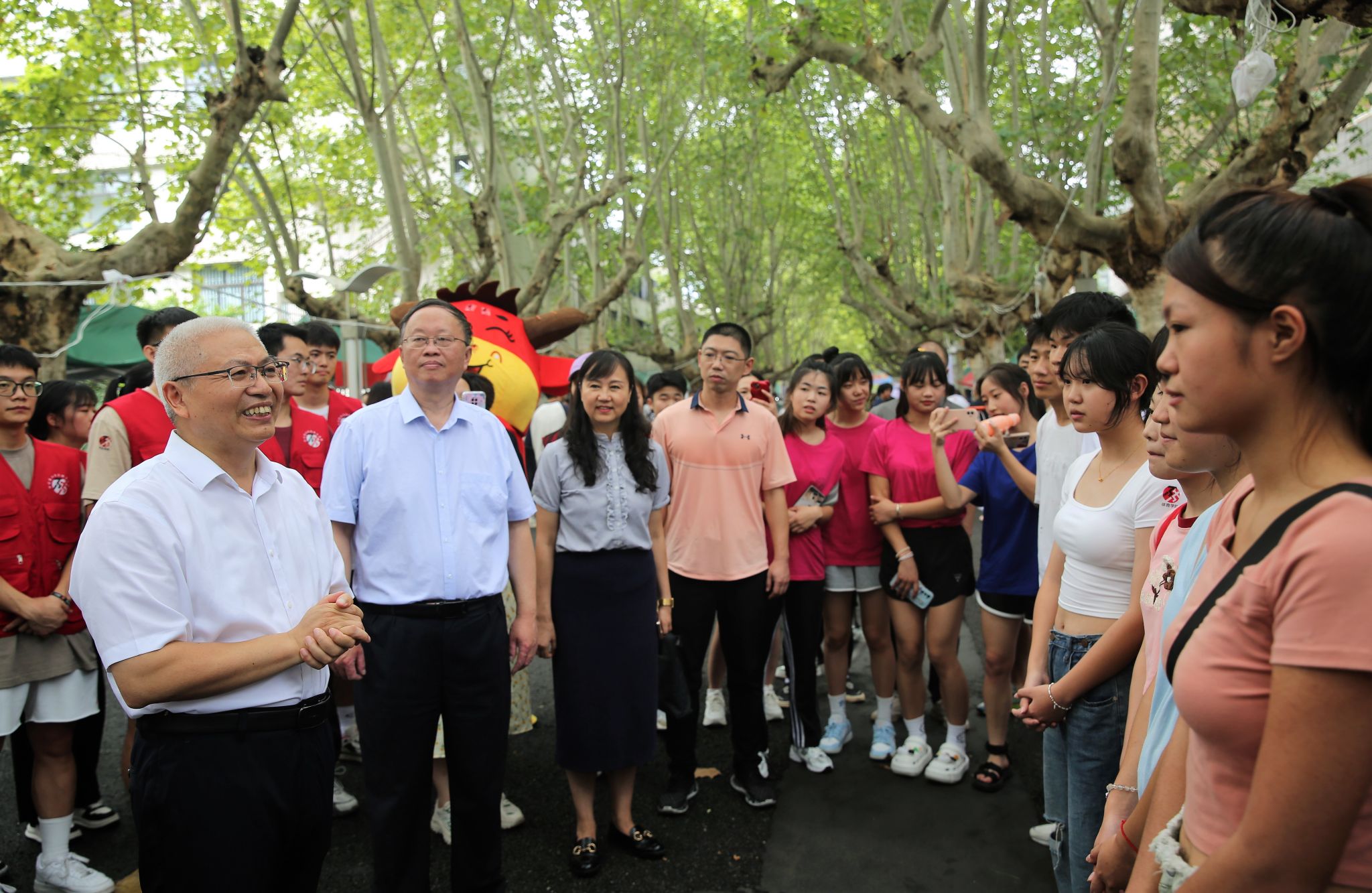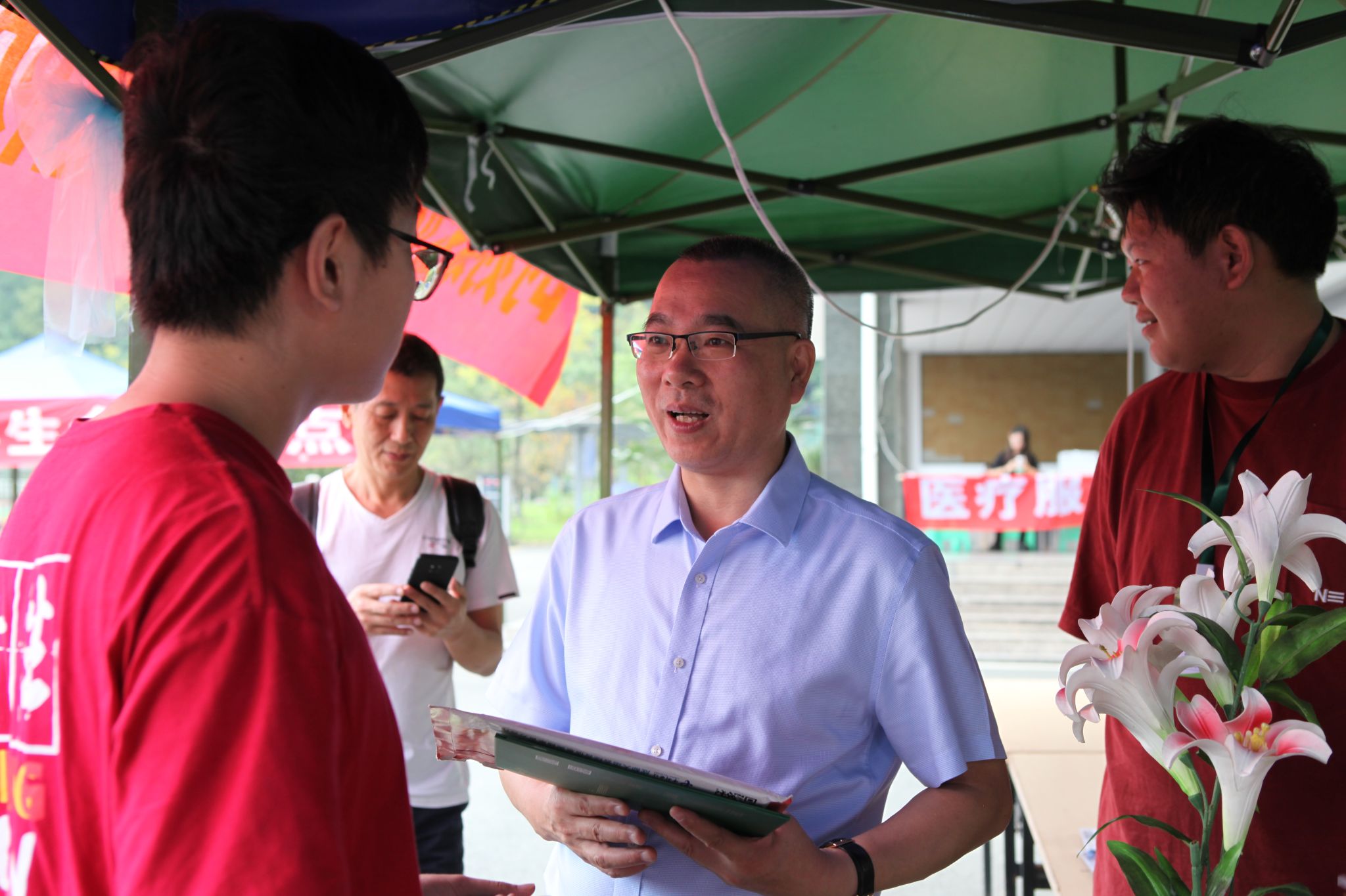 “同学,你家是哪里的?”“学什么专业?”“为什么喜欢这个专业?”校领导来到各学院报到点,与新生及家长亲切交谈,询问报到进展情况,并与新生及家长合影留念。