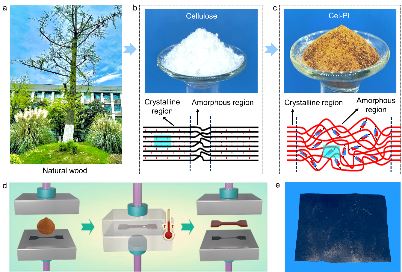 利用动态亚胺化学对木质纤维素进行交联改性,以削弱纤维素分子间的氢键作用、增加纤维素的无定形区比例,从而提高纤维素分子链的热刺激应力松弛行为、自由运动能力和自由运动体积,最终合成了具有优异热塑性加工性能的纤维素基动态亚胺类玻璃高分子(Cel-PI vitrimer)。该Cel-PI vitrimer具有高强度(抗张强度为46 MPa,杨氏模量为2.9 GPa)、可自修复、抗水、可化学降解、可生物降解等优异特性,可应用为高性能可降解塑料。该成果以题为“Robust, waterproof, and degradable cellulose-based polyimine vitrimer for plastic replacement”发表在Chemical Engineering Journal上(中科院一区TOP,IF2021=16.744,N1级)。苏治平副教授为论文第一作者兼通讯作者,硕士研究生崔岚为共同第一作者,tyc41183太阳成集团为第一单位。该成果得到了四川省天府峨眉计划、四川省自然科学基金(2022NSFSC0995)、中国博士后科学基金(2021M702377)等项目的资助。
