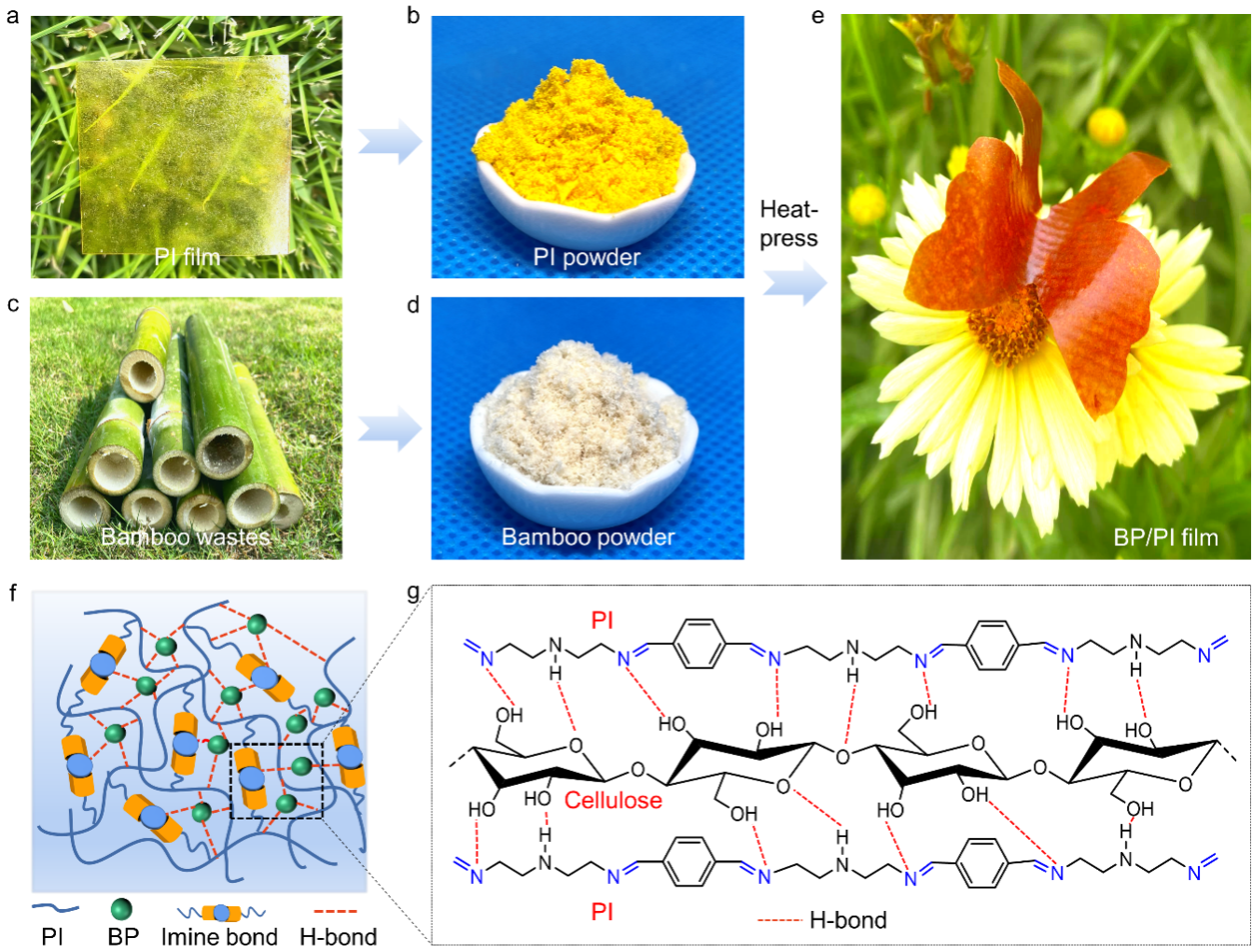 基于动态亚胺化学机理,在室温和无需催化剂条件下合成了动态亚胺自适应网络聚合物(PI),利用热压法把竹粉(BP)复合在PI的动态网络中,并在PI和BP两相界面间构建氢键相互作用,开发出了可热塑性加工、高强度(抗张强度为45 MPa,弯曲强度为122 MPa,杨氏模量为1.5 GPa,弯曲模量为7.2 GPa)、可自修复、可生物降解、可化学降解和闭环回收利用的高性能竹基塑料替代膜(BP/PI)。该成果以题为“A strong, biodegradable, and closed-loop recyclable bamboo-based plastic substitute enabled by polyimine covalent adaptable networks”发表在Chemical Engineering Journal上(中科院一区TOP,IF2022=15.1,N1级)。硕士研究生崔岚为论文第一作者,苏治平副教授为通讯作者,tyc41183太阳成集团为第一单位。该成果得到了国家自然科学基金(32301537)、四川省天府峨眉计划、四川省自然科学基金(2022NSFSC0995)、中国博士后科学基金(2021M702377)等项目的资助。