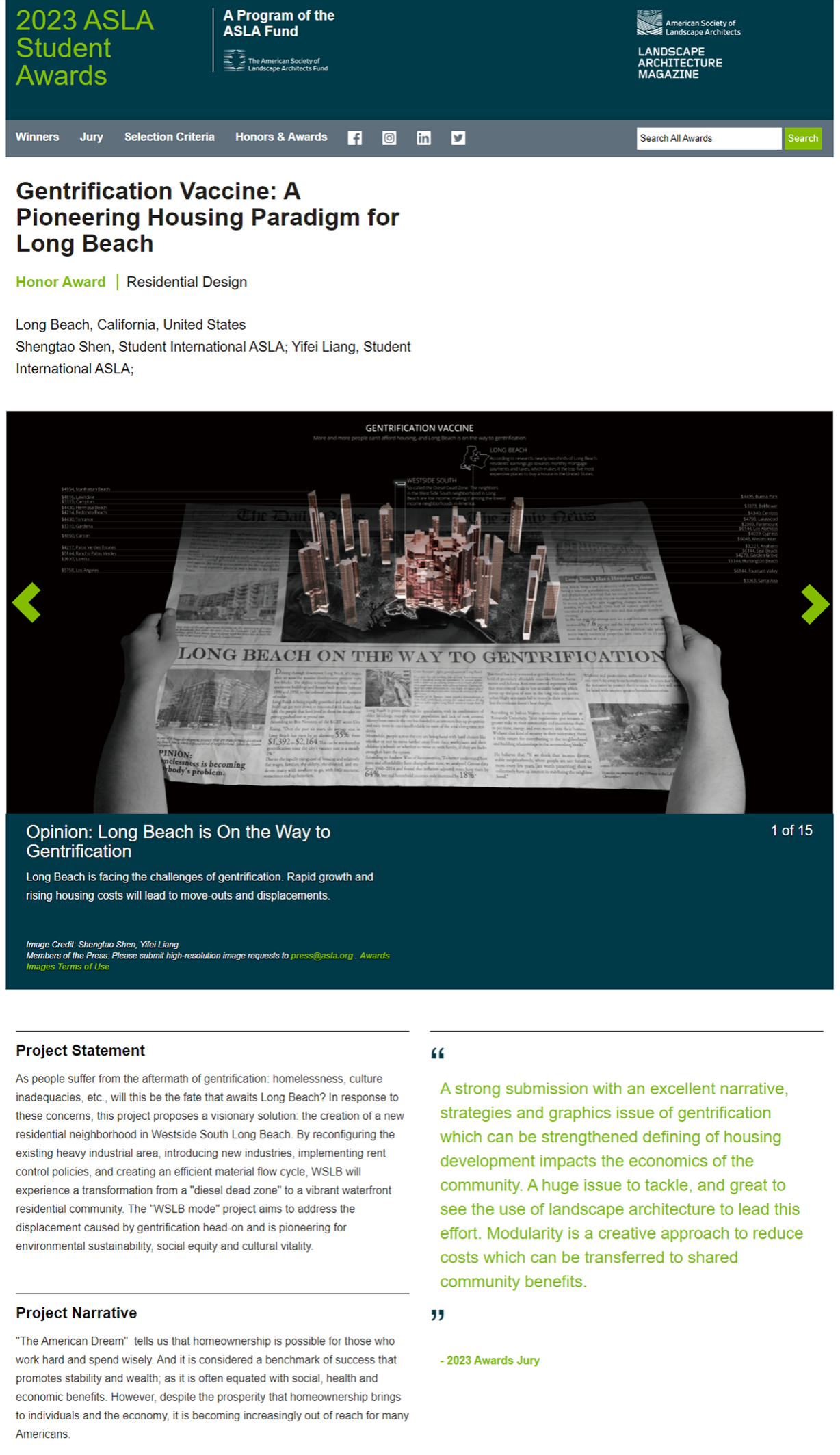 沈圣涛和四川大学在读本科生梁逸飞,在我校风景园林学院青年教师吕兵洋指导下,创作的作品“Gentrification Vaccine: A Pioneering Housing Paradigm for Long Beach”(士绅化疫苗:长滩的先锋住宅范例),通过将一个重工业污染区逐步转变为富有活力的滨水住宅区的创作设计,旨在降低房屋建设与设计成本,解决低收入群体住房困难甚至流离失所的问题。作品开创新的设计获得了评委的一致认可,评审团对此作品评价道:“一份强有力的提案,包括出色的叙述、策略和图像,可以加强对住房开发的定义,从而影响社区的经济。这是一个需要解决的巨大问题,很高兴看到景观设计学来领导这项工作。模块化是一种降低成本的创造性方法,可以转化为共享的社区利益。”最终,沈圣涛的作品从众多参赛作品脱颖而出,获得学生组“住宅设计类”荣誉奖,这也是该类别(住宅设计类)有史以来,第一次由中国国内学生团队获奖,同时也打破了近十年,该奖项则完全由哈佛大学和宾夕法尼亚大学学生“轮流坐庄”的局面。这也是继2016年,风景园林学院研究生余普、罗蓝获得ASLA学生组分析与规划类荣誉奖后,我校学子再次获得这项景观设计界的最高奖项。