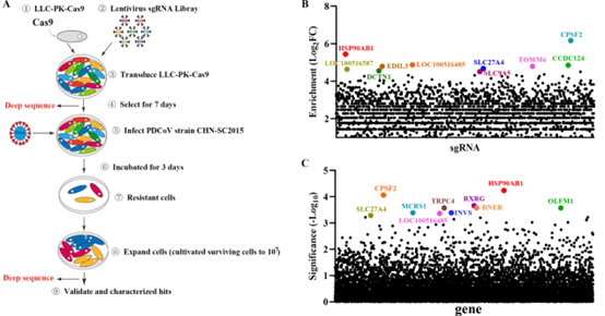 本研究为了挖掘影响PDCoV感染的关键宿主因子,通过CRISPR/Cas9全基因组筛选技术和高通量测序,发现宿主因子HSP90AB1PDCoV感染细胞中被显著富集,细胞中敲除HSP90AB1显著下调病毒增殖水平,且HSP90AB1 ATPase活性参与病毒增殖过程。HSP90AB1可与病毒NNS7NSP10蛋白互作,N蛋白c-tail结构域是与HSP90AB1互作的结构域。此外,研究还发现HSP90AB1通过蛋白酶体途径参与调节N蛋白稳定性,进而影响病毒的增殖。总之,本研究发现并系统揭示了HSP90AB1PDCoV致病机制中的重要作用,有助于丰富PDCoV的致病机制理论,也为开展PDCoV抗病毒研究提供新的宿主靶点。