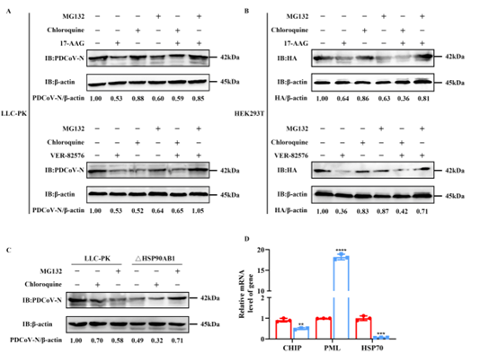 近日,动物医学院猪病研究中心黄小波课题组在自然指数(Nature index)期刊Journal of Biological Chemistry发表题目为“HSP90AB1 is a host factor that promotes Porcine deltacoronavirus replicationHSP90AB1是促进猪δ冠状病毒复制的宿主因子)的研究论文(链接:https://www.sciencedirect.com/science/article/pii/S0021925823025644?via%3Dihub)。本研究发现HSP90AB1是影响猪δ冠状病毒(Porcine deltacoronavirusPDCoV)增殖的一个重要宿主因子,参与维持病毒N蛋白稳定性,防止其通过蛋白酶体途径降解。