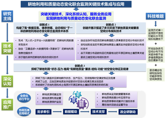 该项科研成果是我校耕地质量保护利用研究团队依托自然资源部耕地资源调查监测与保护利用重点实验室、农业农村部四川盆地平原耕地保育科学观测实验站等平台,联合北京大学、四川省国土科学技术研究院、四川省耕地质量与肥料工作总站等单位,在国家科技支撑计划、国家公益性行业科研专项、国家自然科学基金等多个项目支持下,通过近十年联合攻关,突破了多项“卡脖子”关键技术形成系列标志性成果。该成果创建了“数据采集-信息挖掘-动态模拟的耕地利用动态变化和多元要素-复合结构-多重功能的耕地质量动态变化两大联合监测技术体系,系统阐明了复杂环境下耕地利用“状态-压力-格局和耕地质量要素-结构-功能时空变化特征及规律,构建了需求牵引-数据驱动-技术支撑的政企研联动推广模式,发表论文42篇、授权发明专利2项、登记软件著作权18项、出版专著1部,在四川省成都市、遂宁市、南充市等21个地市州、28家技术机构和行业企业进行了推广应用,支撑完成国土变更调查、卫片执法、耕地动态监测、耕地质量评价、退化耕地治理、永久基本农田试划等技术服务项目800余个,累计产生经济效益20多亿元。该项成果有力推动了耕地利用和质量动态变化监测的一体化、精细化、智能化水平,为四川乃至西南地区耕地动态监测和智能监管提供了重要的科技支撑。