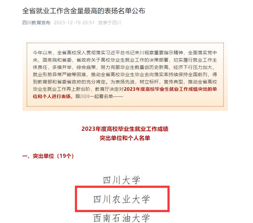 12月19日,2023年度四川省高校毕业生就业工作成绩突出单位和个人评选结果揭晓,我校名列这份全省高校毕业生就业工作含金量最高的表扬名单之中,学校招生就业处副处长王文龙荣获2023年高校毕业生就业工作成绩突出个人的荣誉称号。