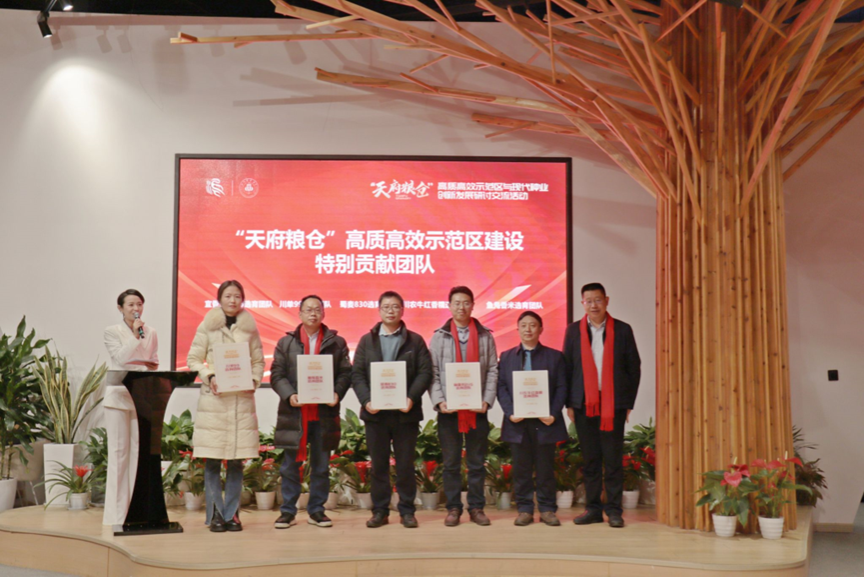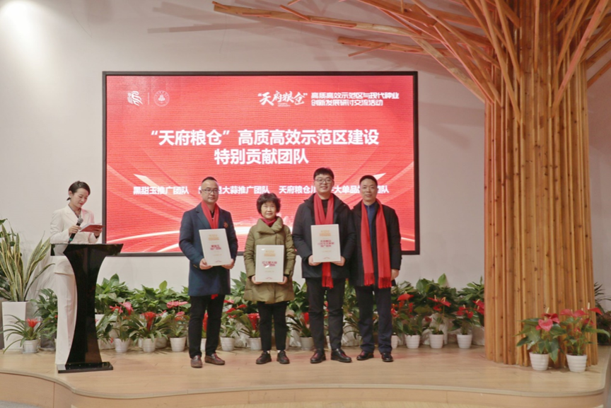 活动举行了“天府粮仓”高质高效示范区建设特别贡献团队发布仪式。刘登才为宜香优2115选育团队、川单99选育团队、蜀麦830选育团队、川农牛红香糯选育团队、鱼凫香米选育团队颁奖。文可绪为黑甜玉推广团队、红七星大蒜推广团队、“天府粮仓”川农牛大单品推广团队颁奖。