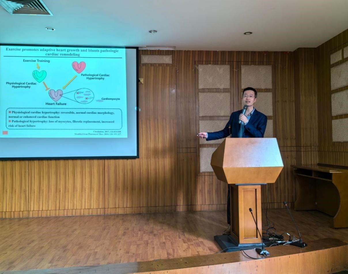 会上,肖俊杰作题为“基于运动锻炼关键靶点探索心力衰竭防治新策略”的学术报告。他以自身的研究成果为案例,深入阐述了运动锻炼对心血管健康的促进作用,详细介绍了其在运动促进生理性心肌肥大、抑制心肌细胞凋亡等方面的研究成果,分享了最新的科研动态和思路。同时,听取了我校在生命科学领域的研究进展及发展规划,并与我校教师进行了深入的交流。双方就未来可能的合作方向进行了积极的探讨,达成了初步合作意向。
