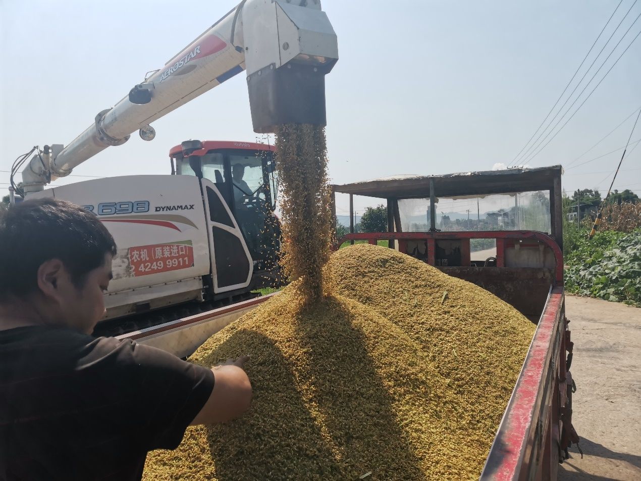 水稻机械化生产服务团队根据邻水县适宜种植再生稻的特色,制定了杂交中稻-再生稻全程机械化的高产攻关技术方案,重点攻克冬水田再生稻区齐苗壮根机械育秧、减穴稳苗机械栽插、机收头季稻蓄留再生稻等关键技术。项目团队3月份开展了暗化催芽无纺布覆盖育秧技术培训和指导,育出了高质量机插秧苗。4月上中旬应用减穴稳苗机插配套同步侧深施肥技术,确保栽插基本苗,减少漏插率。在生育期间优化施肥技术,无人机施用穗肥专用肥和粒芽肥,确保头季稻大穗、足穗和再生芽快发早发。同时,水分优化管理确保收获期田块硬度高,通过低留桩机械收获技术,减少对头季稻稻桩的碾压和提高收获效率。该项目首次在川东地区实现了杂交中稻-再生稻的机插机收和机械化管理,将引领四川未来再生稻的机械化生产。