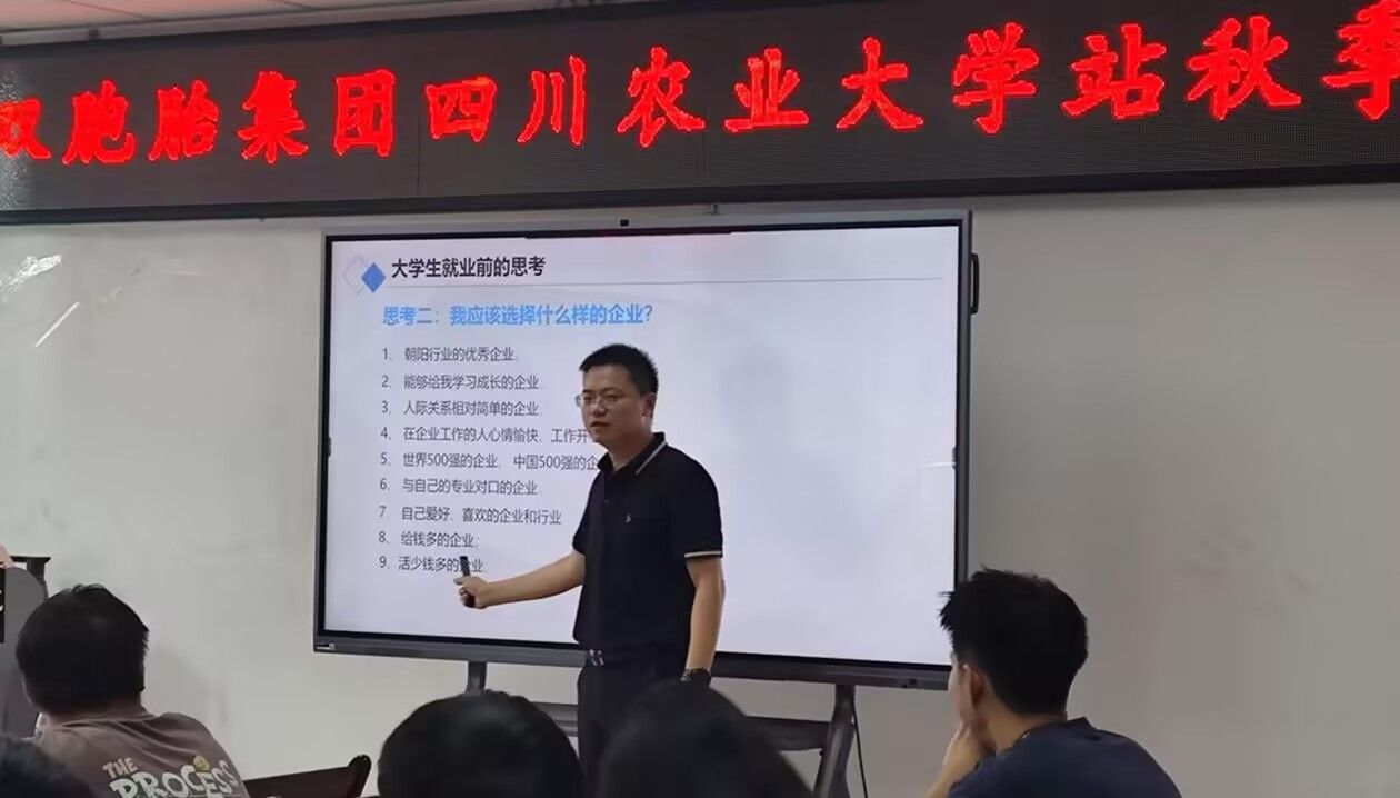 9月13日,学院邀请到双胞胎集团到校开展首场2025届毕业生专场招聘会,并邀请到双胞胎集团人力资源部部长林勇先生担任讲师,为在场的动科、动医学子们带来了一场关于就业与选择的深度解析。