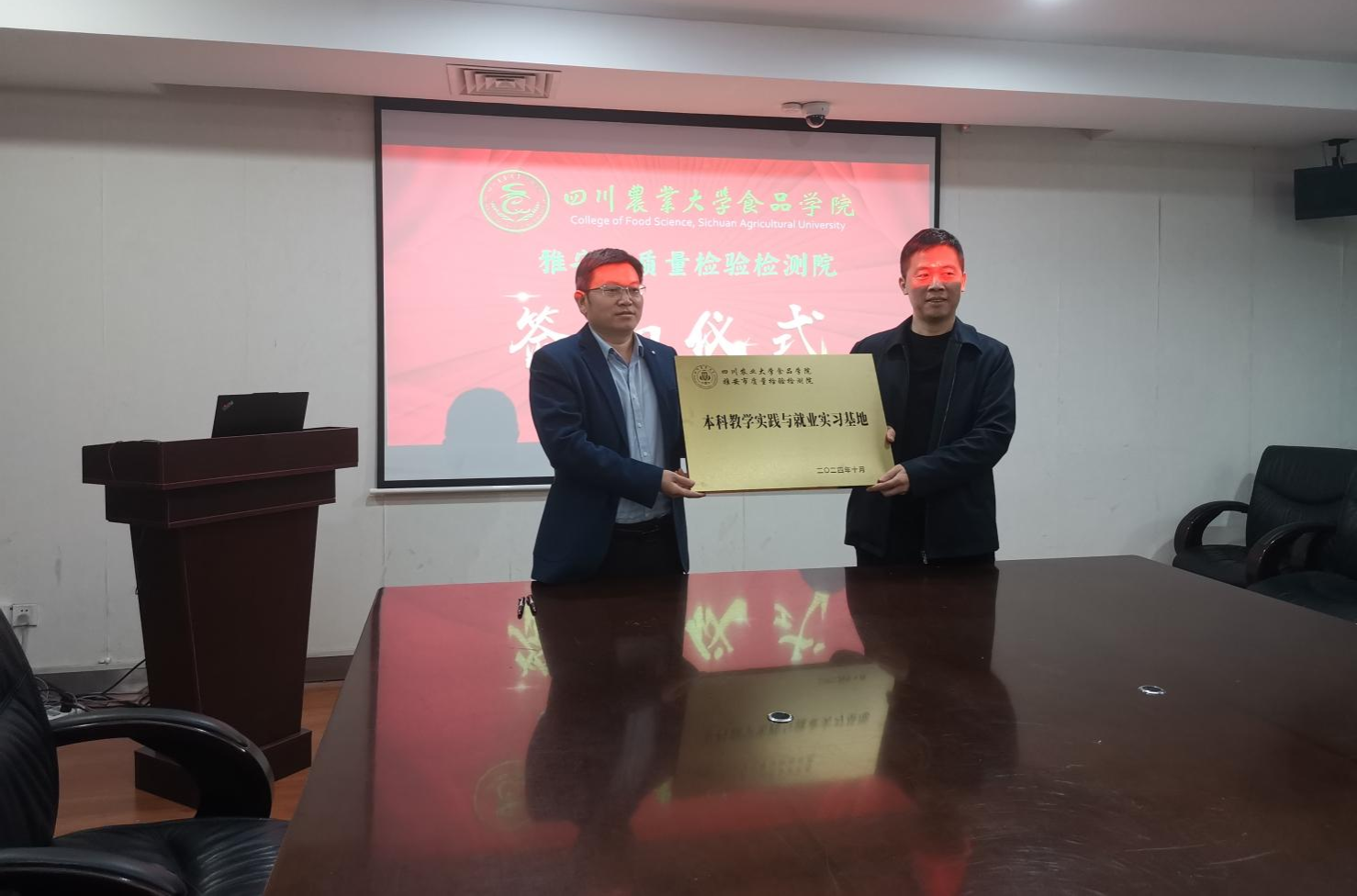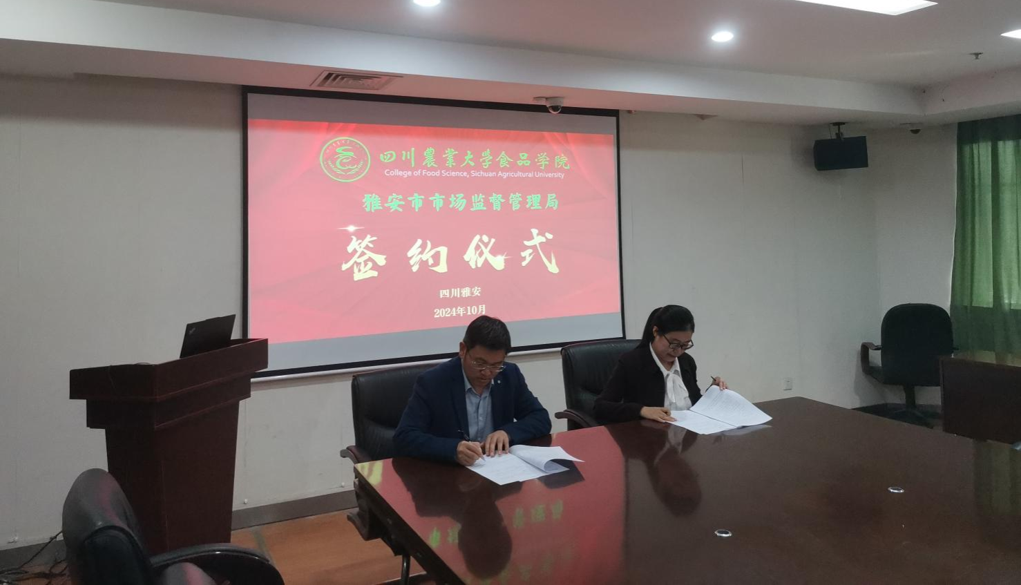 随后,双方围绕科研项目合作、共建科技创新中心、学生实习实践等方面展开热烈讨论并达成一致意见。双方达成并签订了《雅安市市场监督管理局-tyc41183太阳成集团食品学院战略合作框架协议》、《雅安市质量检验检测院-tyc41183太阳成集团食品学院战略合作框架协议》,共建本科生、硕士生教学实践实验与就业实习基地,方正锋代表食品学院向质量检验检测院授牌。