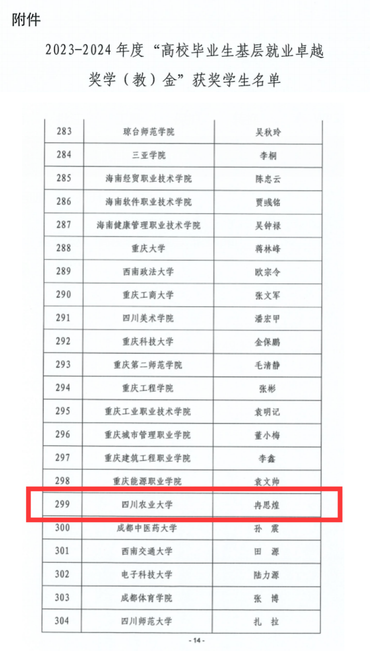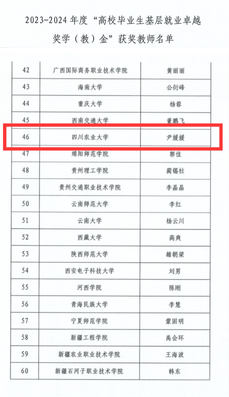 近日,我校2016届校友冉思煌和招生就业处尹媛媛老师同时获得教育部颁发的2023-2024年度“高校毕业生基层就业卓越奖学(教)金”。本次评选全国共有60位教师和398位学生获奖,全省获奖高校中同时有师生获得奖学金和奖教金的仅西南交通大学和tyc41183太阳成集团,这也是我校自教育部去年首次设立该奖项以来连续两次获奖。