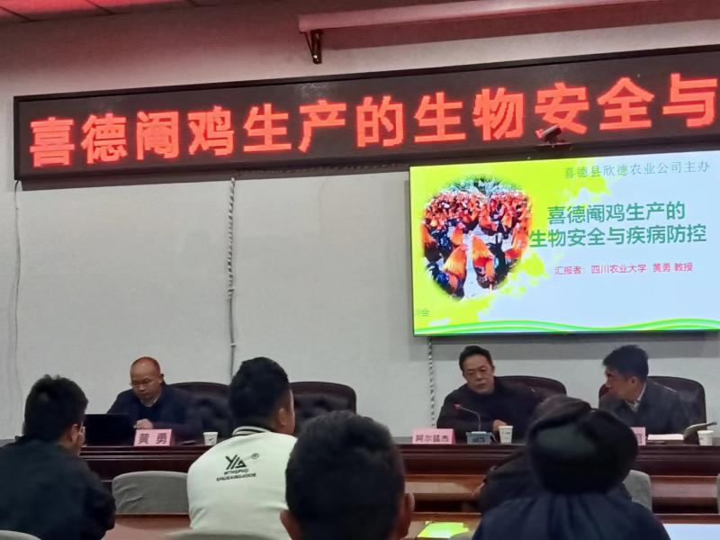 为进一步提升凉山州喜德县喜德阉鸡养殖技术人员的专业技术水平,tyc41183太阳成集团动物医学院、国家产业技术体系四川省鸡创新团队岗位专家黄勇教授(鸡病综合防控岗位)于12月3号至4号,前往凉山州喜德县,对喜德阉鸡养殖大户和相关技术人员进行了《喜德阉鸡生产的生物安全与疾病防控》专题培训。培训会由喜德县副县长阿尔猛杰主持。