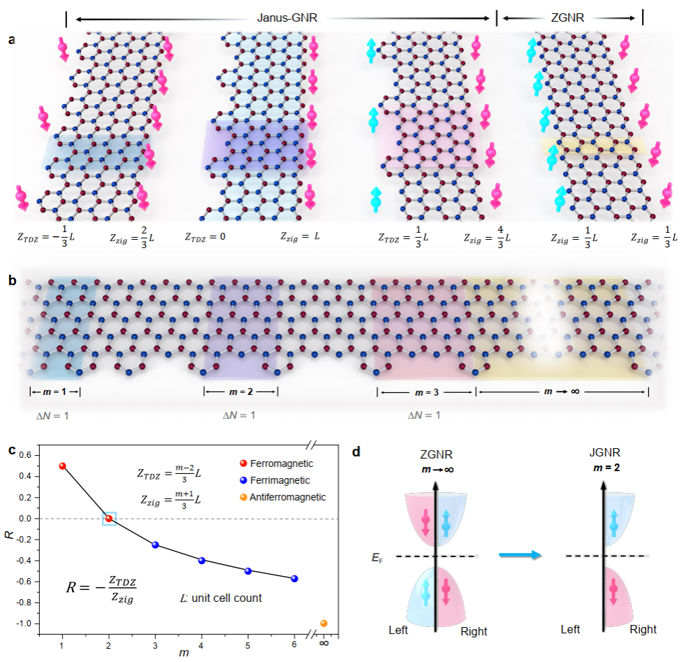 许振等团队成员在开创性合成和表征具有两种不同边缘设计的Janus GNRs(JGNRs)方面取得了突破,成功地利用“Z形”前体设计制备了两种m=2的JGNRs。本次制备的JGNRs与之前报道的6-ZGNR的“U形”前体不同,Z形前体由两个独立的分支组成,可以独立进行修饰。这使得研究人员可以对形成的JGNRs的两个边缘几何进行独立的控制。通过精心设计和修饰前体的这两个分支,研究人员能够制备出具有单一锯齿边缘的JGNRs。此外,通过调节联苯基分支的长度,可以调节JGNRs的宽度,从而调节JGNRs的带宽。采用先进的扫描探针显微镜/光谱学和第一性原理密度泛函理论进行表征,确认成功制备出单个自旋极化锯齿形边缘的铁磁基态JGNRs。