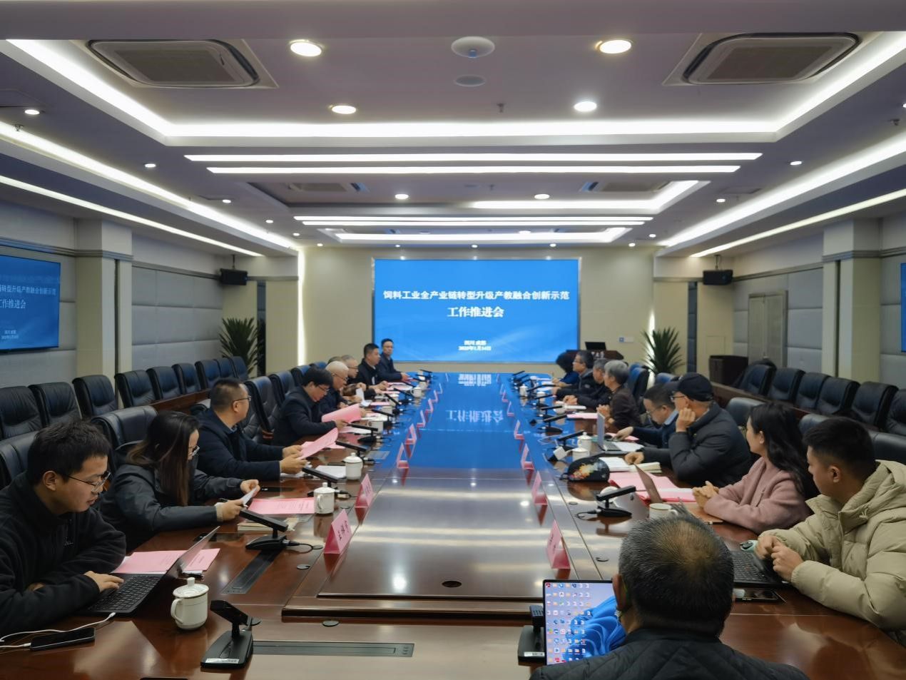 1月14日,“饲料工业全产业链转型升级产教融合创新示范”项目工作推进会在成都校区举行。校长吴德,副校长王际睿,以及教务处、动物营养所、食品学院、动物科技学院、动物医学院、农学院相关领导及团队,铁骑力士集团相关负责人参会。