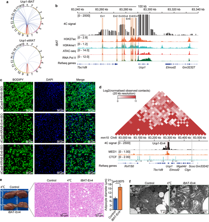 该研究利用环状染色质构象捕获技术,绘制了棕色脂肪组织(BAT)和白色脂肪组织(WAT)中Ucp1的高分辨率染色质互作图谱,揭示了BAT和WAT之间Ucp1染色质互作的显著差异。鉴定了四个BAT特异性Ucp1活性增强子,其中三个增强子的活性受冷刺激诱导。通过转录抑制(CRISPRi)Ucp1-En4活性增强子区域,损害棕色脂肪细胞的线粒体功能。同时,研究明确了EBF2转录因子与乙酰转移酶CBP协同作用,调控Ucp1-En4的活性并增加Ucp1的转录水平。进一步在体内通过慢病毒介导的Ucp1-En4增强子活性的抑制,导致在寒冷适应条件下BAT的产热能力和线粒体功能受损,最终揭示寒冷条件下Ucp1增强子对棕色脂肪产热的作用和生物学功能。
