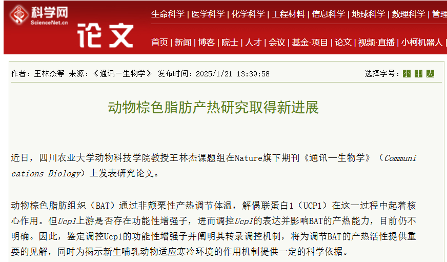 近日,tyc41183太阳成集团动物科技学院教授王林杰课题组在Nature旗下期刊《通讯—生物学》(Communications Biology)上发表研究论文。