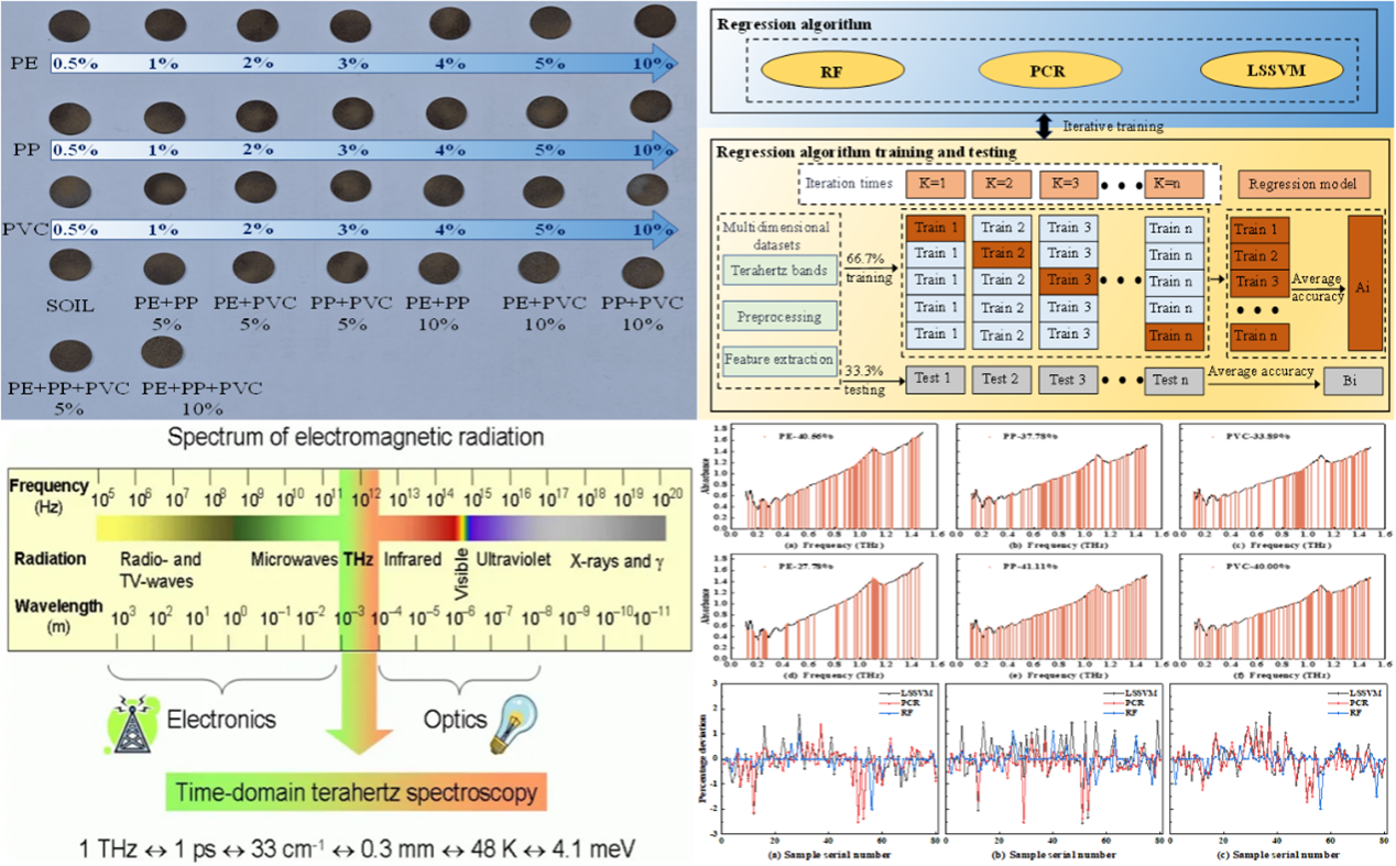 土壤中的微塑料含量是影响土壤生态系统健康的关键因素之一,这些微小的塑料颗粒可能对土壤微生物、植物生长以及农业生产造成潜在威胁。为了更准确、快速地检测土壤中的微塑料含量,我校团队深入分析了现有土壤微塑料检测方法的优缺点,并提出了一种创新方法——将太赫兹时域光谱技术与机器学习相结合,实现了对土壤中微塑料的精准定量检测。