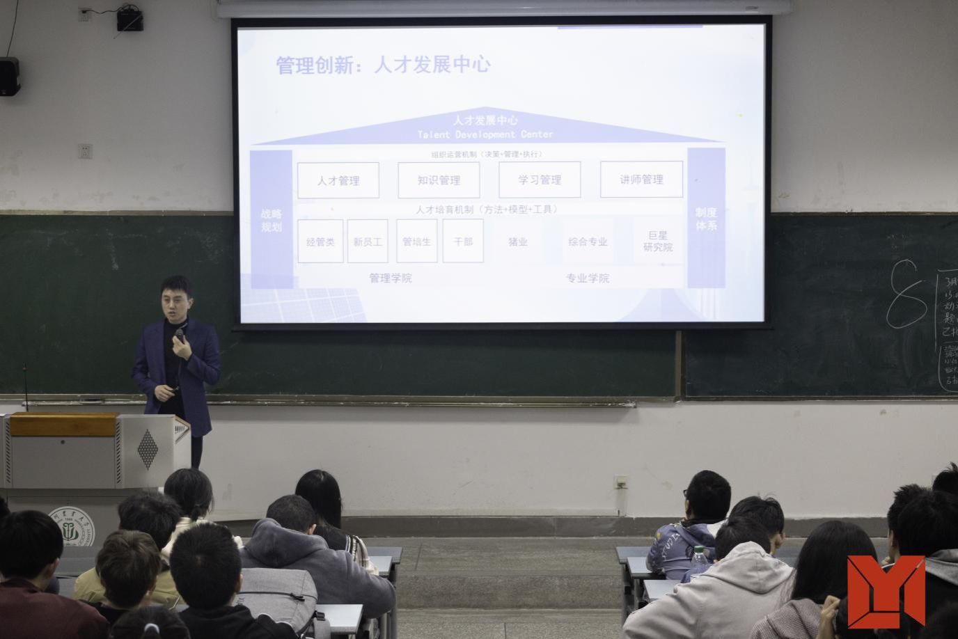 刘泓晖以“巨星农牧的昨天、今天与明天”为主题,通过详实的数据展示了企业从1994年创立至今的发展历程。特别是2005年转型社会养殖后,企业通过“技术+管理”双轮驱动,实现了年收入60亿元、利润5.18亿元的亮眼业绩。在分享中,刘泓晖重点解析了巨星农牧集团别具一格的“保姆式”人才培养体系,通过对比行业通用模式,让学子们直观感受到巨星农牧在人才培育方面的差异化优势。