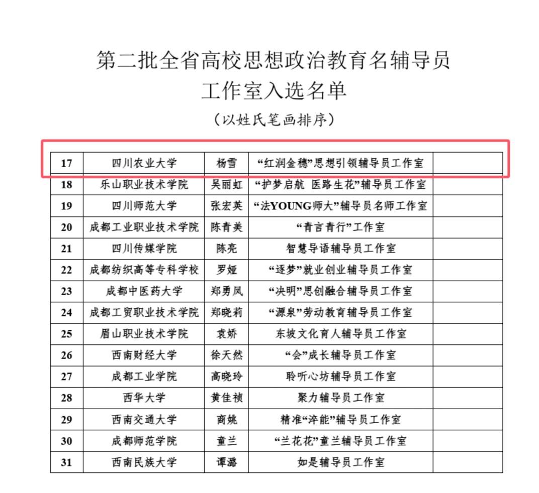 近日,四川省教育厅公布了第二批高校思想政治教育名师工作室立项情况,我校动物科技学院党委副书记杨雪主持的“‘红润金穗’思想引领辅导员工作室”成功入选。