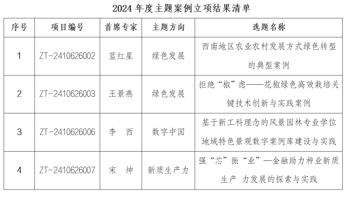 日前,教育部学位与研究生教育发展中心公布了2024年度主题案例立项结果。本次主题案例征集围绕“绿色发展”“新质生产力”“健康中国”“数字中国”四个主题展开,经过“单位审核推荐”“专家分组评议”“案例专家委审核”三级评审确定立项名单。我校蓝红星、王景燕、李西、宋坤作为首席专家申报的4个项目获批立项。