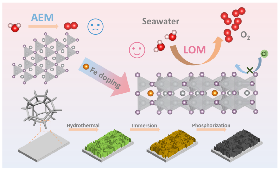 研究团队通过Fe掺杂调控Ni2P的电子结构,成功实现了析氧反应(OER)路径从传统的吸附质演化机制(AEM)转变为晶格氧氧化机制(LOM),这一转变从根本上优化反应的热力学和动力学,显著提升了催化剂的性能。另外,在海水电解过程中,催化剂表面自发形成的磷酸盐层能有效抵抗海水氯离子的腐蚀,并通过动态表面重构始终保持高活性,这种“双重防护”机制有效地提高了催化剂的稳定性。这项研究不仅攻克了海水电解中催化剂活性低、易腐蚀的难题,还建立了“电子结构调控激活高效反应机制”的关键策略,为设计高性能海水电解催化剂提供了新思路。