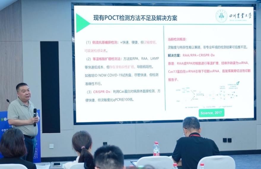 本次会议共举行21场主题学术报告、12场企业学术报告和10场青年学者学术报告。其中,我校徐志文教授作了题为“基于CRISPR-Cas13d的猪重要疫病现场可视化检测技术研究与应用”的学术报告,介绍所在的动物生物技术研究中心开发的具备现场即时检测(POCT)特点的下一代诊断技术“CRISPR-Dx”。此外,博士生陈本豪和硕士生杨扬也分别作了青年学者学术报告,展示了他们在动物微生态领域的最新研究成果。