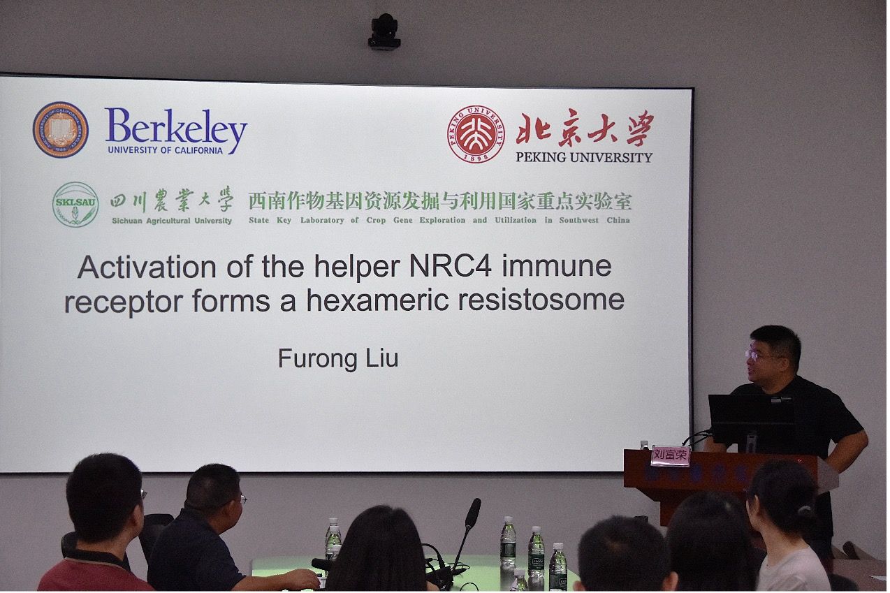 8月14日,北京大学现代农学院刘富荣研究员受邀来校,以“Activation of the helper NRC4 immune receptor forms a hexameric resistosome”(辅助NRC4免疫受体的激活形成六聚体抗病小体)为题,为我校师生带来了精彩的学术报告,国家重点实验室、农学院、水稻所等单位的师生积极参加本次学术报告。报告会由国家重点实验室主任陈学伟教授主持。