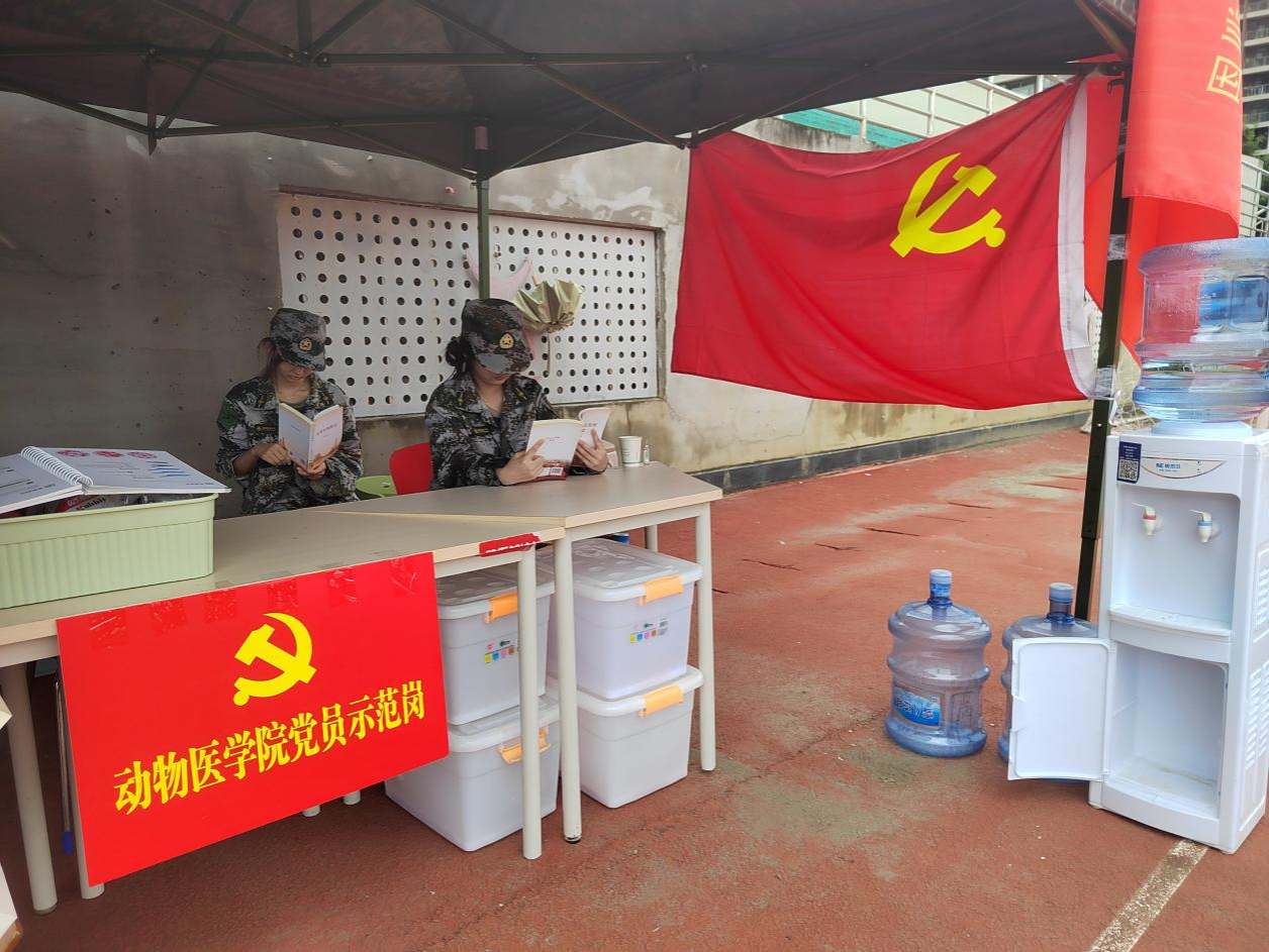 2025级新生军训期间,动物医学院推出“军训+理论教育”融合育人模式,在军训场边精心打造“红色书籍阅读角”与“党员示范服务岗”,成为迷彩阵营中一道亮眼的红色风景线。