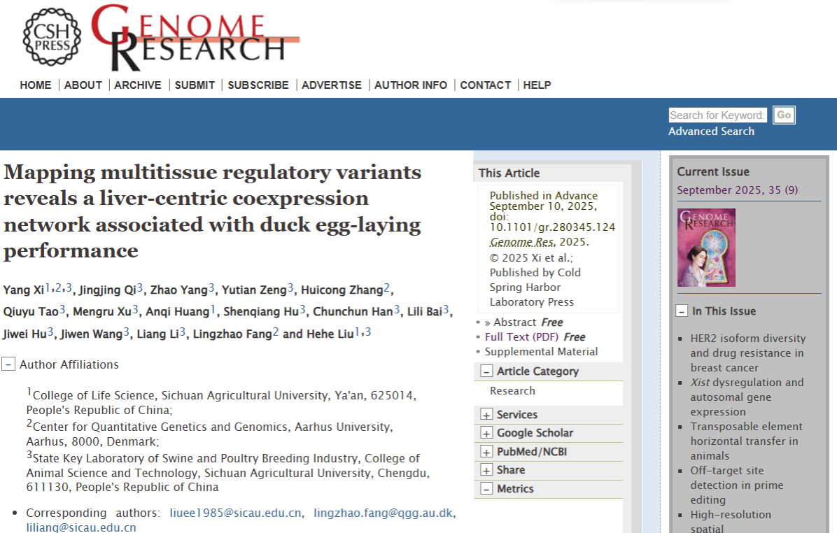 生命体的多样性源于遗传与环境的共同作用,可测的生物性状或多或少都受到遗传效应影响,但这些遗传效应(变在哪)通过哪些分子过程(怎么变)影响性状,仍是亟待解决的关键问题。近日,我校生命科学学院、猪禽种业全国重点实验室刘贺贺教授团队在自然指数期刊《Genome Research》上发表研究论文,首次构建了鸭多组织分子QTL图谱,系统解析了蛋壳颜色和产蛋量等重要经济性状的遗传调控基础,不仅为解析禽类复杂性状的遗传机制提供了高质量数据资源和分析方法,也进一步推动了分子QTL在非模式物种中的广泛应用,对水禽育种产业具有重要指导意义。
