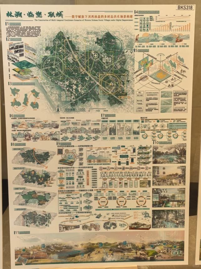 本科生组卓越奖作品《林溯·临塑·联域——数字赋能下川西林盘的多时态共生场景构建》,由郑晴航、韩秋妍、王益可、黄宇婕、余旭平完成,指导教师熊薇、汪昕梦。该方案结合乡土元素,运用参与式设计方法,强调设计创意与功能优化,致力于打造贴近百姓生活的绿色空间。